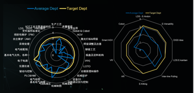 第四步,基于能力差距构建了未来蓝领的技能发展模型,主要包括传统技能和新型技能两大类别,其中,传统技能又被分为三类:工艺、质量和安全,新型能力则涵盖8大类,共计34个能力项。这些能力项共同形成了可视化的能力模型看板,并被用不同颜色区分哪些是目前已经掌握的技能,哪些是待培育和升级的技能,每位员工也会拥有自己的能力雷达图。