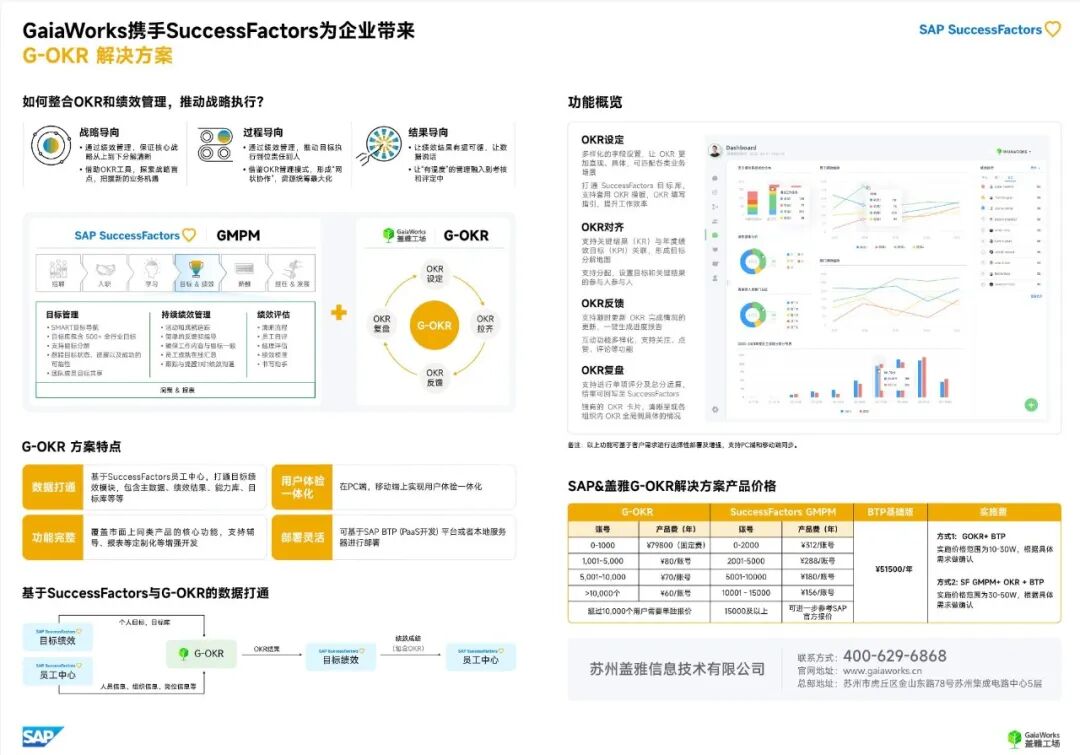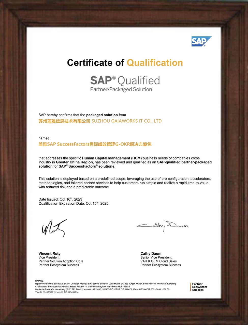 同时,盖雅工场另一款应用「目标绩效管理G-OKR解决方案包」也在近日获得了SAP QPPS (Qualified Partner Package Solution) 的官方认证。这一认证也再次展现了盖雅在绩效管理领域的全面方案能力。