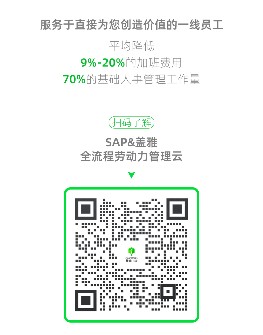除了以上的奖项及认证,10月初盖雅工场还被SAP推荐为SuccessFactors企微移动应用服务商。盖雅的「移动自助门户」已获得SAP的QPPS认证,盖雅的「G移动入职」应用也持续在SAP Store上热销。至此,GaiaWorks WFM和SAP SuccessFactors的联合方案除在应用功能上实现了全流程覆盖劳动力管理,还在「移动体验」领域实现了全场景,进一步提升了融合价值。