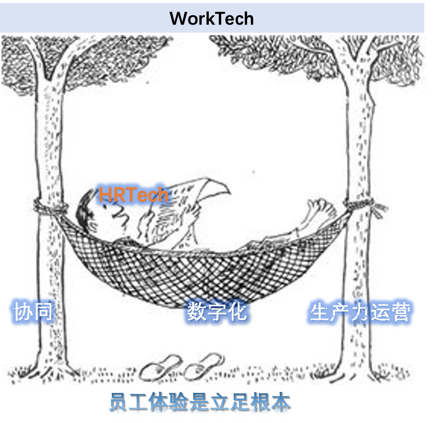 无论哪一方面,我认为WorkTech是立足于员工体验,依托协同工具和生产力运营两大支柱,以数字化为桥梁和承载基座,以HRTech等为具体落地形式的复合模型。